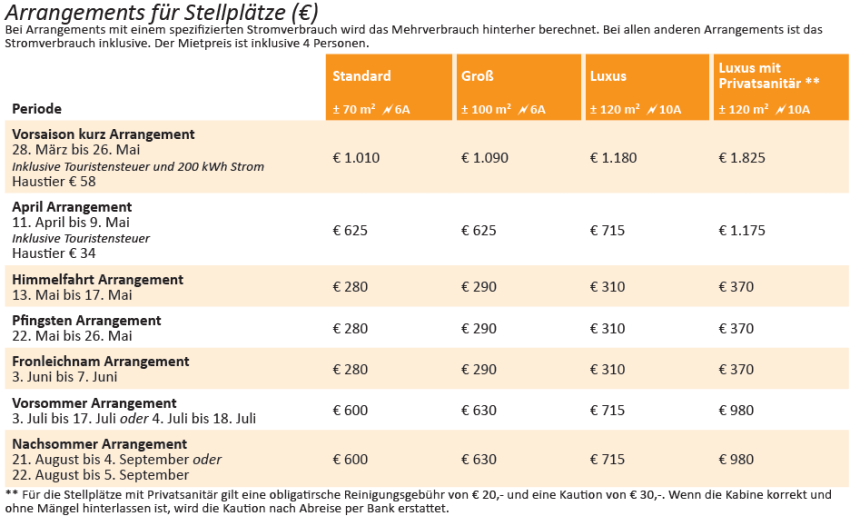 Sofern nicht anders vermeldet, sind die nachfolgenden Stellplatztarife inklusive 4 Personen, 1 Campingmittel mit eventuell 1 Beistellzelt, Zugang zum Campingplatz für 1 PKW, Strom, Wasser, warme Duschen und Mwst. Pro Platz sind maximal 7 Personen und nicht mehr als 1 Familie (1 Haushalt) erlaubt.