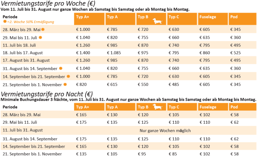 Tarife Mietunterkünfte pro Nacht und pro Woche 2026